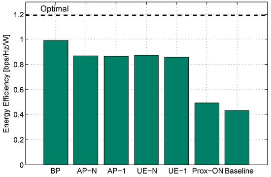 Figure 4 shows the average energy efficiency obtained through 200 iterations, and the results are summarized in Table 2. For every iteration of the proposed BP algorithm, UE update and AP update are repeated five times where and . The baseline is the case when all APs are turned on. In addition, proximity-ON is a simple heuristic algorithm, and thus, it can provide performance guidelines for other DANCE algorithms, such as AP-first and UE-first. Furthermore, we find the optimal solution by using exhaustive search. Therefore, it can be possible to compare our algorithms’ results to the case that maximizes energy efficiency.