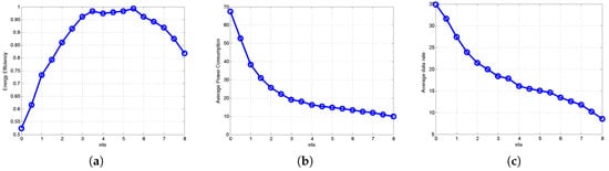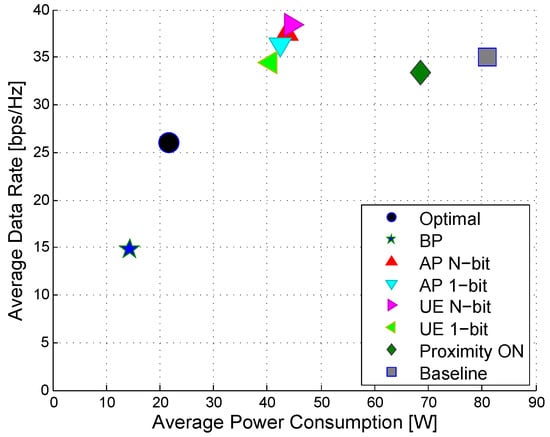 Energy efficiency, power consumption and data rate can vary with respect to η. As shown in Figure 6a, energy efficiency is maximized when . In Figure 6b, average power consumption decreases as η increases. Similarly, we observe from Figure 6c that the average data rate also decreases as η increases. This is because when η is high, the UE is associated with a small number of APs having a high value of . Then, only a small number of APs is turned on and provides connectivity for all UEs, so the overall power consumption is decreased. However, since only a few APs operate, the data rate becomes low. As a result, the desired high energy efficiency can be achieved at some proper value of η. Note that in Figure 5, as , the BP moves from the current star-marked position (★) where energy efficiency is maximized () to the position of proximity-ON (⋄). That is because proximity-ON is a special case of BP when . Thus, η is a network operator’s design parameter considering energy efficiency, power consumption and the data rate.