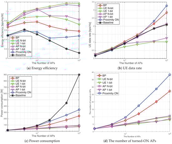 Figure 7 shows the results in the case of 50 UEs where the number of APs varies from two to 100 in the hexagonal area with a radius of 158 m, so that the density of UEs, i.e., the number of UEs per , remains the same as the small-sized network in Section 5.1. As can be seen in Figure 7a, the energy efficiency of BP and DANCE is highly improved compared with the baseline. The energy efficiency of the baseline mainly decreases in the number of APs because power consumption is proportional to the number of APs. However, BP and DANCE successfully restrict the number of turned-on APs and consume lower power resulting in higher energy efficiency. For example, BP achieves five-times and AP/UE N-bit achieves nine-times higher energy efficiency than that of the baseline for the case of 100 APs. Note that, unlike the case of the small-sized network, AP/UE N-bit shows better energy efficiency than BP because BP uses the approximated factor graph. Consequently, the energy efficiency of BP increases in the practical number of APs, but has a peak around 10 APs and then decreases. However, note that the data rate of BP is the highest until 20 APs. As easily expected, the energy efficiency of proximity-ON is not very good, and that of the baseline is poor.