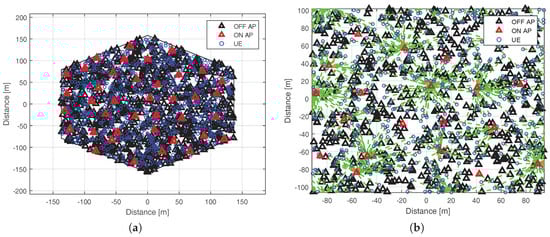 An example of the ON/OFF states of 1000 APs when the UE-N algorithm is used in the case of 1000 UEs. (a) Thirty nine APs turned on among 1000 APs; (b) user association between turned-ON APs and UEs.