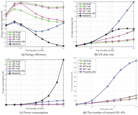 As can be seen in Figure 9, densification results in a higher data rate, but severe interference plays a role as densification goes on, specifically for the case of the baseline. We observe that the energy efficiency and data rate both grow rapidly in the low densification region, e.g., 100 APs or less. The benefit of densification in this region is well illustrated; a small increase of AP density brings the advantage of an increased data rate that outweighs the disadvantage of the increased power consumption. In addition to the baseline, one can compare the proposed algorithms with another type of baseline; since [28] corresponds to UE-1, one can see that UE-N can increase the energy efficiency up to 62.5% over that of [28] in Figure 9a.