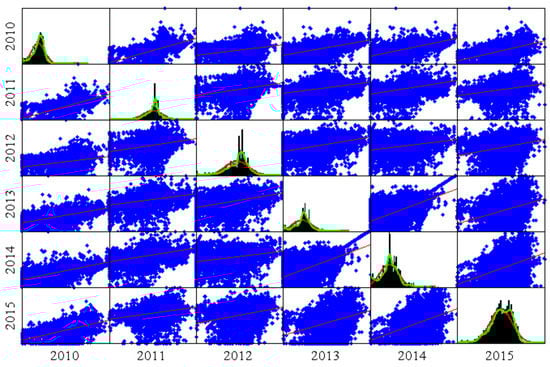 The forecasts are obtained for the Spanish electricity market prices. The prices are quite different for each year; Table 1 shows a summary of the statistics, and Table 2 presents the correlation matrix of the Spanish electricity prices from 2010–2015 [33]. The high standard deviation of prices of years 2013 and 2014 is remarkable, whose values are €20.73/MWh and €21.14/MWh, respectively. These values are two-times the standard deviation of the prices of 2011. This analysis is made using ECOTOOL (2016) [34], a forecasting toolbox in MATLAB® (R2011b) [35].