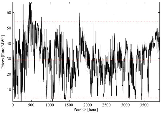 Figure 1 portrays the scatter plots and the histograms of all of the hourly prices of each one of the six years. Red lines in the histograms indicate the shape of the normal distribution, whilst the green lines describe the real shape of the distribution that follows those data. Figure 2 depicts the sample of 2016, from 1 January–10 June 2016; the mean price is equal to €29.17/MWh, and the standard deviation of prices is €12.35/MWh. The time series of the day-ahead electricity market prices is transformed using a logarithmic transformation to make the dispersion constant.