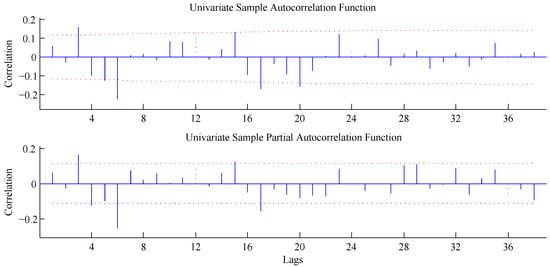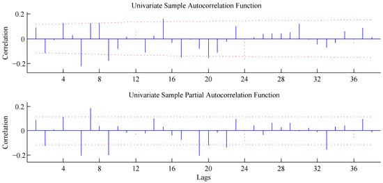 Following the formulation of (16), the indexes of each term for every ARIMA model are shown in Table 3. The process to select each term of each ARIMA model is based on the evaluation of each autocorrelation function (ACF) and partial autocorrelation function (PACF) of the residual component, , of each ARIMA model, as shown in Figure 4 and Figure 5.