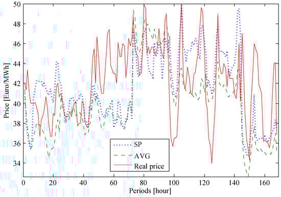 Prices of the SP model, average forecasted price (AVG) and real prices for the week of 4–10 June 2016.