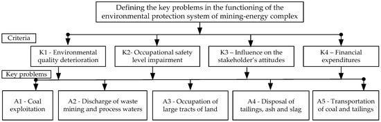 Figure 1 represents the criteria for determination of key problems in the functioning of environmental protection system in a mining and energy complex, in the case of surface mine and thermal power plant “Kostolac” in the Republic of Serbia [23].