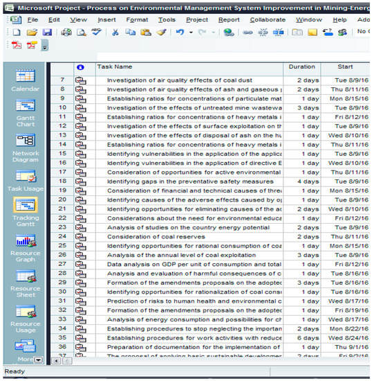 The first phase of the project management system for improving environmental protection in energy complexes is the definition of the necessary model actions which would adhere to the basic principles of sustainable development. Table 5 presents project activities. The relation between activities and their order of execution has been established within the defined project management activities (Table 5). The defined activities form the basis for the realization of management program by applying the MS Project software package. Figure 3 gives an order of execution of the project activities to improve the environmental protection system in mining and energy complexes.