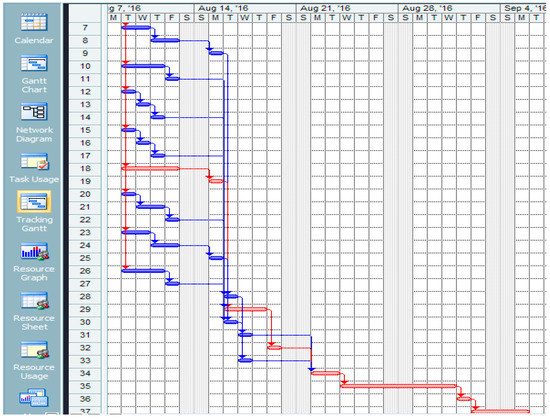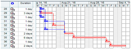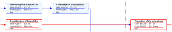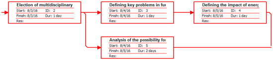 Based on the analysis of activity duration (Table 5 and Table 6), we determined the critical path (Figure 4). It represents a chain of interrelated activities that have the same earliest and latest time durations. It stretches between the initial and the final event.