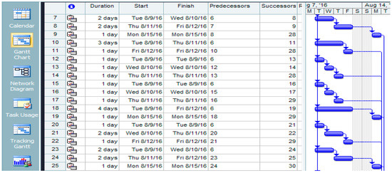 Based on the network plan (Figure 4), we conclude that special attention should be given to the activities that belong to the critical path. It is necessary to extend the time for consideration of basic principles of sustainable development on which to base the improvement of the management system (n6), but also for the activities n1, n2, n3, n4, n5, n6, n18, n19, n29, n32, n34, n35, n36 and n37, as can be seen in Table 6. The process of making a model for project management starts with critical activities related to the consideration of options for improving the management system (n1), selection of members of the multidisciplinary team (n2), and analysis of the basic principles of sustainable development (n3), which is evident in the initial part of the gantographic display (Figure 5) and the network plan (Figure 6).