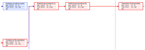 Based on Figure 9, we concluded that attention should be given to the activities n29, n32, n34, n35, n36, and n37, as any extension of their duration can lead to delays in project completion. Network plan of final activities (Figure 9) shows the activities of the environmental values analysis (n34), establishing the procedures of performing work activities while reducing environmental pollution and complying with the European standards (n35), production of documentation for the implementation of regular analysis procedures for the impact of work activities and timely risk identification (n36), and the proposed application of basic principles of sustainable development in the process of improving the environmental management system (n37), which take place after the changes in short-term and long-term objectives (n29) and changes in the environmental policy (n32).