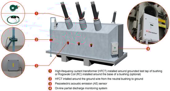 The PDtracker system was designed for continuous, multi-month fieldwork. Therefore, the specialised firmware not only allows for continuous registration of PD activity but also for correct work of the system itself (e.g., temperature and humidity inside the enclosure or operation of the electronic measuring circuits). The firmware is equipped with advanced data processing modules that make it easier to evaluate events and noise filtering (wavelet-based denoising). In addition to registration and calculation of basic parameters (e.g., AE hits rate, energy and amplitude of AE pulses, dominant frequency), the program also creates an event log whose goal is to inform, with a specified frequency (service station or the superior system), about the work of the PD monitoring system or about a threat to the transformer resulting from intensity discharge growth [8]. External communication is provided using a GSM (Global System for Mobile Communications) modem with an additional antenna or LAN/WLAN network (Local/Wireless Local Area Network). Optionally, in order to increase the reliability of PD detection and to determine the source of the AE signals (internal PDs or external acoustic disturbances), the PDtracker system can be equipped with high-frequency current transformers (split ferrite core; bandwidth from 400 kHz to 10 MHz) installed around the ground wire, from neutral bushing to ground or around the grounded test tap of bushing [9]. The system can also be equipped with Rogowski Coils installed around the base of the bushing (just above where the porcelain and metal flange join). Currently, work is underway to deploy the UHF module with probes installed in the transformer via the oil drain valve or in the mounting flanges [10]. A typical arrangement of the sensors for PD monitoring is shown in Figure 2.