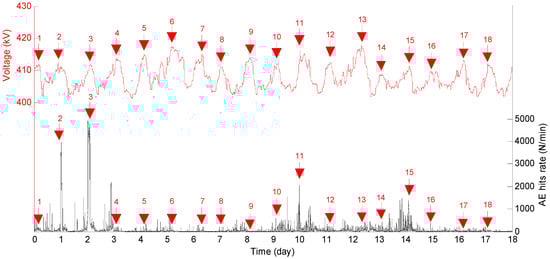 The PDtracker system was implemented in short- or long-term monitoring mode on a dozen power transformers. Most of the transformers were chosen by the power grid operator on the basis of negative results during a periodical diagnosis (the most common cause was a growing level of dissolved gases in oil). In most cases, analysis of the measurement data recorded by the system confirmed the stochastic nature of the PD phenomenon, which is affected by the complexity of the mechanisms of its generation and development (e.g., local electrical stress concentrations in the insulation or on the surface of the insulation, thermal and electrochemical ageing of the insulation). This fact is well illustrated in Figure 3, which summarises the activity of PD (AE hits rate per minute) as a function of voltage registered for one of the monitored power transformers (330 MVA, 400/110 kV). In the analysed period (18 days), it may be observed that it was not always increased electric field intensity (in Figure 3, the voltage peaks are marked by arrows) that determined the moment of initiation of PD phenomena and its activity level.