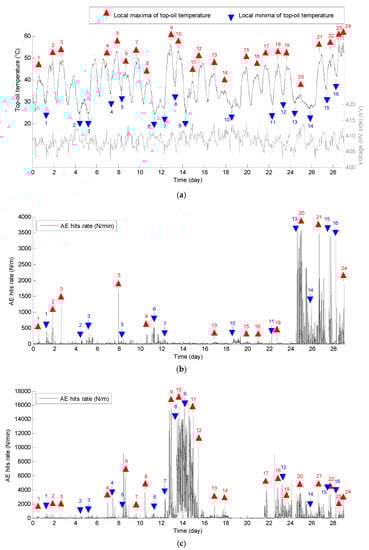 (a) Comparison of voltage, top-oil temperature (peaks and troughs are marked by arrows); (b) PD activity (AE hits rate per minute) registered in the high voltage HV1 phase; and (c) PD activity (AE hits rate per minute) registered in the high voltage HV2 phase during monthly monitoring of a 330 MVA/400 kV/110 kV power transformer.