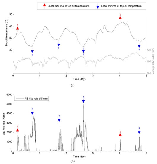 (a) Comparison of voltage, top-oil temperature (peaks and troughs are marked by arrows); and (b) PD activity (AE hits rate per minute) registered in the low voltage LV1 phase during five-day monitoring of a 250 MVA/400 kV/110 kV power transformer.