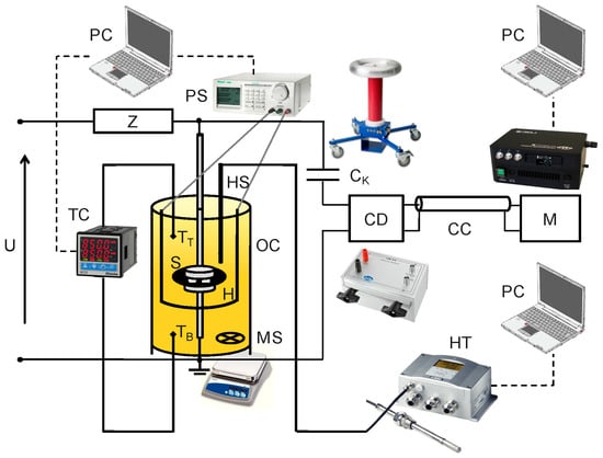 A measurement set-up was designed and compiled for the experiment. It allowed for simultaneous realisation of multiple tasks, i.e., (i) the generation of a surface PD in the model of an oil-paper insulation system; (ii) PD detection by means of the conventional electrical method according to norm IEC 60270 [28]; (iii) controlling and monitoring of the oil temperature; (iv) monitoring of moisture content in oil; and (v) oil-circulation forcing in the test chamber. The temperature of oil was measured by means of three sensors. Two of them (Pt1000 sensors) were connected to the temperature controller (TC). These sensors were used to control of the heating procedure and to monitor the top (TT) and the bottom (TB) oil temperature. Moreover, the temperature of the oil in the middle part of the chamber was measured using a Vaisala probe (humidity and temperature sensor (HS), Vaisala, Helsinki, Finland). The humidity and the temperature sensors were placed directly above the magnetic stirrer (700 rpm) to improve their response time. A schematic diagram of the measurement set-up is presented in Figure 6.