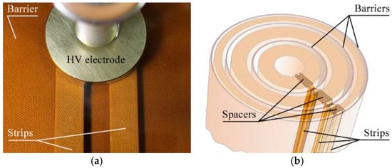 Based on these assumptions, the authors decided to use the electrode arrangement presented in Figure 7a, which approximately reproduces the part of the transformer insulation, i.e., the oil duct-strip-barrier (Figure 7b).