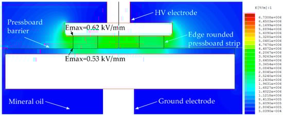 Figure 8 shows the analysis of the distribution of the electric field for the electrodes used in the experiment. The voltage applied to the system was 30 kVrms. The simulation results show that the greatest electric field intensity is in oil gaps created by the rounded edge of the pressboard strips. The authors hypothesised that, during the process of moisture migration, water molecules are drawn into this area and may help to initiate the surface discharge.