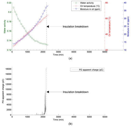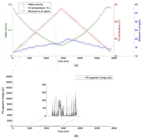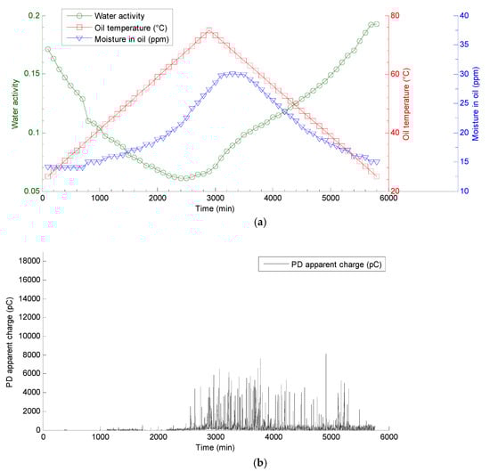 Typical experimental results obtained for an insulation sample with a moisture content of 5.7%: (a) water activity, temperature and moisture content of oil; and (b) PD apparent charge.