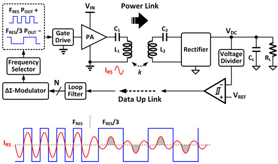 Figure 3 illustrates a primary side non-linear control method by changing the PA switching frequency between the LC resonant frequency FRES and its odd-order sub-harmonic frequency FRES/3 [11]. In this system, the energy delivery from the PA to the LC tank is reduced from once every resonant period at the input frequency of FRES to once every three resonant periods at the input frequency of FRES/3, as shown by the conceptual waveforms in Figure 3. Thus, the transmitted powers at these two different input frequencies are changed. Note that, although the input frequency of the PA would vary between FRES and FRES/3, the LC resonance tanks of the power link still always operate at their resonant frequency because the resonant tank is a band-pass filter.