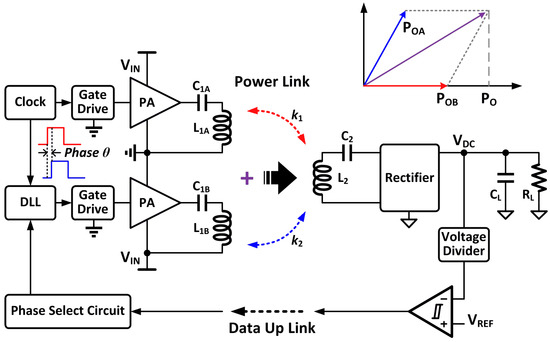 A two-transmitter topology was also proposed in [12] for non-linear primary side power control, as shown in Figure 4. Two physically overlapped TX coils L1A and L1B are driven by two separate PAs. In addition, the input clocks of these two PAs have the same frequency but different phases, controlled by a delay-locked loop (DLL). When the power demand signal is fed back to the primary side, the phase select circuit will increase or decrease the phase difference θ between those two clock signals to adjust the combined output power of the two PAs. With larger phase difference, the combined output power is less, and vice versa. The combined output power PO can be approximately expressed as POA × (1 + cosθ), where POA is the output power of a single PA.