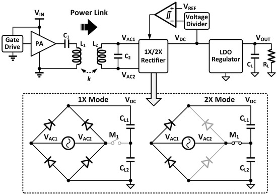In a WPT system without primary side power control, a reconfigurable rectifier that can adapt its operation mode according to output voltage level, which can provide a coarse regulation instead and extend the output power range as demonstrated in [13,14,15]. Figure 5 shows an inductively coupled WPT system with reconfigurable rectifier for low power applications. A hysteresis comparator is used to compare the rectifier DC output voltage with the reference voltage and to decide the reconfigurable rectifier being operated at either mode. The hysteresis window used here is relatively large (say, 1 V), and only 1-bit resolution can be provided by two modes, making the VDC not accurate enough for the load. Thus, an LDO regulator is still needed in such systems for fine regulation.