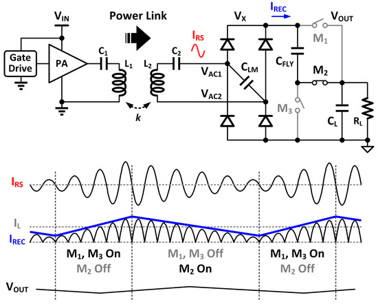 Consequently, a continuous conduction mode (CCM) was also proposed in [17] with one fly capacitor CFLY and three switches M1–M3, as shown in Figure 8. The CFLY and switches conduct like a step down charge pump. When M1 and M3 are on and M2 is off, CFLY is in parallel with CL, and the full-wave rectifier charges up VOUT. When M1 and M3 are off and M2 is on, CFLY is in series with CL. Then, VX would be roughly two times that of VOUT, and IREC starts to decrease. In the CCM operation, IREC is continuously provided to the load, which results in higher power conversion efficiency and lower output voltage ripples. In addition, the current variations of IRS and IREC are less, relieving the voltage stress on VX, and, consequently, smaller CLM could be used.
