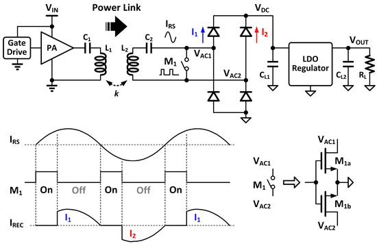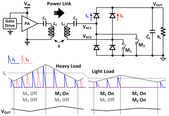As shown by the conceptual waveforms in Figure 11, the switch M1 will be turned on at the zero-crossing point of the resonating current IRS, which is commonly known as zero-current switching (ZCS). To avoid the switch experiences of high voltage and current simultaneously, which causes unnecessary conduction loss, ZCS is an important operation principle for high efficiency. During the M1 on-state, the high-Q resonant tank L2 and C2 stores the maximum energy that is transferrable from the primary side. During the M1 off-state, the energy stored in the resonant tank together with the new coming transferred energy is delivered to the load through I1 and I2 of the rectifier. Therefore, the amount of energy that transferred to the load can be controlled by tuning the on-duty cycle D of the switch. Different from the above-mentioned regulation schemes, this scheme achieved the regulation within one cycle at the WPT frequency, requiring faster control circuits (faster transistors).