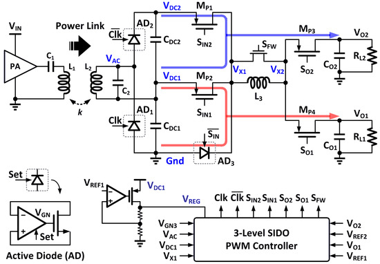 To demonstrate the idea, a three-level single-inductor dual-output (SIDO) DC-DC converter was designed for the WPT RX [27], which synergizes with an active voltage doubler and generates three DC levels (including the Gnd). As shown in Figure 13, VO2 draws current from VDC2 and VDC1, and, consequently, provides an output voltage between those two voltages. On the other hand, VO1 draws current from VDC1 and Gnd, and delivers an output voltage lower than VDC1. Therefore, two separate regulated output voltages are obtained from three voltage levels through one inductor L3.