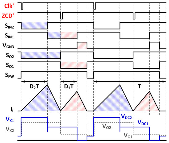 The voltage and current waveforms of the three-level SIDO converter operating in DCM is given in Figure 14. The clock signal can be simply recovered from VAC by an inverter, and the short pulse Clk’ that sets the starting point of the PWM control for VO1 can be obtained by a pulse generator [27]. A pulse of the zero current detection signal (ZCD’) that initiates another PWM control for VO2 can be obtained by sensing the drain current of MP2 with a comparator detecting the MP2 source and drain voltages, and it determines the inductor current goes to VO1 or VO2 by swapping the control signals SO2 and SO1. Because both VO2 and VO1 get current from VDC1, MP2 should be kept on during the SO2 and SO1 transition period to reduce the switching loss of MP2. For an accurate detection, a large static current of the comparator is needed for fast speed and for the optimum SO2 and SO1 switch timing. Alternatively, an additional low bandwidth adaptive loop that dynamically adjusts the comparator artificial offset for delay compensation can significantly relax the speed requirement of the comparator, as designed in [3]. Because the adaptive loop only needs a very low loop bandwidth, 200 kHz in [3] for example, it only consumes the current on the order of 1 μA. To attenuate the undesired voltage ringing caused by L3 and the parasitic capacitors on VX1 and VX2 nodes when either of them are floating, a freewheel switch [29] SFW will be turned on when both AD3 and MP4 are off at the end of each cycle. On the other hand, for higher conversion efficiency and/or large output power capability of the SIMO converter, lower switching frequency should be used [30].