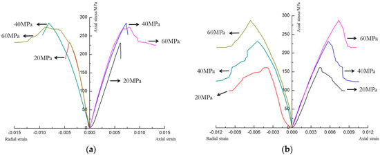 Young’s modulus and Poisson’s ratio also change with confining pressure. In uniaxial compression tests, the minimum value of Young’s modulus is only 50% of the maximum value. However, in triaxial compression tests under the confining pressure of 60 MPa, the minimum value of Young’s modulus is approximately 68% of the maximum value. Similarly, the minimum value of Poisson’s ratio is only 50% of the maximum value in uniaxial compression tests, while 83% of that in triaxial condition at 20 MPa.