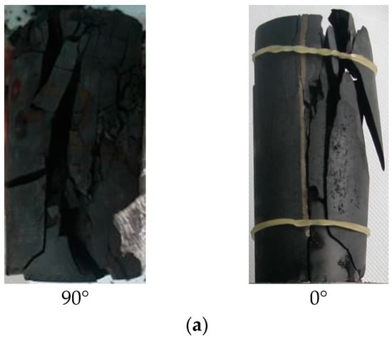 Figure 9 shows the failure morphology of shale samples subjected to uniaxial compression. Shale samples after uniaxial compression showed different deformation and failure morphology with different inclinations (β). According to different fracture patterns, the samples can be divided into three groups. In group (a), at 0° and 90° inclinations (β), the failure fractures are mostly along the axis and the failure types mostly belong to splitting failure; In group (b), at 15° and 75° inclinations (β), the failure fractures have two types: one parallel to the direction of bedding planes and the other parallel to the axis, but the majority are the latter; In group (c), at 30°–60° inclinations (β), the fractures are mostly along the direction parallel to the bedding planes, and most fracture planes are not mutually independent, but connected by longitudinal fractures parallel to the axis direction.