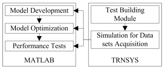 The ANN model in this study focused on calculating the time (TIMPSPT) required for the current indoor temperature during the unoccupied setback period to ascend to the target setpoint temperature of the occupied period. Figure 2 shows the flow of the ANN model development process. The ANN model in this study incorporated Transient Systems Simulation (TRNSYS 16.1) software [55] and Matrix Laboratory (MATLAB) [56] programming software. The test module was modelled using the TRNSYS software where data sets for ANN model training, optimization, and prediction performance tests were collected. After completion of the data collection, the ANN model was developed using MATLAB off-line.
