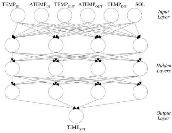 One hundred training data sets were prepared for the training model. Each data set was composed of six input values (TEMPIN, ΔTEMPIN, TEMPOUT, ΔTEMPOUT, TEMPDIF, and SOL) and one output value (TIMESPT). The sliding-window method was used to manage the training data sets. Therefore, when a new data set was acquired, the new set replaced the oldest set. Then training was conducted. The Levenberg-Marquardt algorithm was used for the model training with a 0.0-min goal, 1000-times epoch, 0.2-momentum, and 0.6-learning rate, which were found to be the optimal values by a previous study [57].
