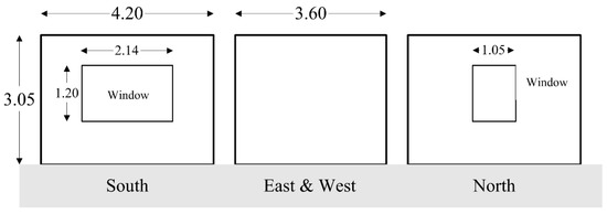 The dimension of the module was 4.2 m (width), 3.6 m (depth), and 3.05 m (height) approximating the basic and the simplest residential space. The envelope components were assumed to have 3.72, 0.71, 6.80, 3.70 m2·K/W thermal resistance for the wall, windows, roof, and floor, respectively. The thermal resistances of the envelope were greater than required in Korea (2.78, 0.41, 5.00, and 2.32 m2·K/W for each envelope component). A radiant heating system that could supply 12,000 kJ/h of heat. No windows were installed on the east or west walls, and the window-to-wall ratios were 0.20 and 0.10 for the southern and northern walls, respectively. The moderate value for the infiltration rate was assumed to be 2.0 air changes per hour (ACH), which is a normal value. Two occupants, lighting fixtures, and equipment were considered for calculating the internal heat gain.