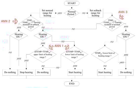 In addition, the proposed ANN model performance needs to be comparatively investigated by using diverse optimization schemes such as the constructal theory or entropy generation minimization methods. Also, other machine learning methods such as support vector machine (SVM), random neural network (RNN), and model predictive controller (MPC), should be compared to the proposed model. Those methods were stated to predict the indoor temperature conditions more accurately and to maintain indoor temperature more stably in a couple of studies [62,63]. Through these comparative tests, the most applicable method will be found. Finally, the control algorithm, as previously shown in Figure 2, needs to be organized to employ the proposed prediction model and tested for its performance in further studies.