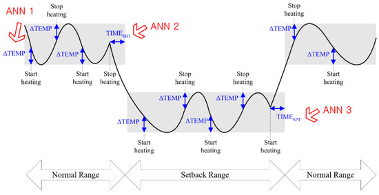 Figure 6 conceptually shows the temperature profile of the day. By providing the predicted values—ΔTEMP, TIMESBT, and TIMESPT, the three ANN models can help to create more comfortable and stable thermal conditions. In particular, the ANN model (ANN 3) developed in this study predicts the TIMESPT, and this predicted value is used to predetermine the end of setback. By predetermining the end of the setback period, the temperature at the beginning moment of the occupied period is closer to the normal range. For example, if the current indoor temperature is 19.0 °C during the unoccupied setback period and the designated target setpoint temperature is 23.0 °C, the TIMESPT is the amount of minutes needed to raise the current indoor temperature from 19.0 to 23.0 °C. If the sum of TIMPSPT and the current time reaches the beginning moment of the normal setpoint period (i.e., the occupied period), the algorithm determines the normal setpoint temperature to be employed at that moment before the actual occupied period begins.