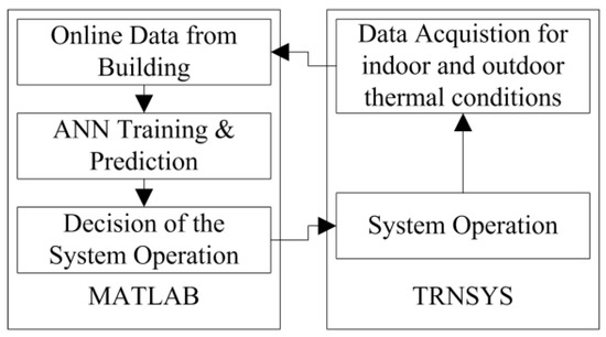 Figure 7 shows the flow of algorithm operation. As with the ANN model development process, the algorithm development and operation were conducted using TRNSYS and MATLAB. The building and system were modelled using the TRNSYS software. The current indoor and outdoor thermal conditions were collected and transferred to the control algorithm developed using MATLAB. The data was used for the iterative training of the ANN model and for predicting TIMESPT. Based on the TIMESPT, the algorithm decided how to operate the heating system, which would be transferred to the system in the TRNSYS. This process was repeated in a closed loop. Figure 8 shows the modeling results in the TRNSYS, while Table 4 summarizes the types and roles used in the TRNSYS modeling result.
