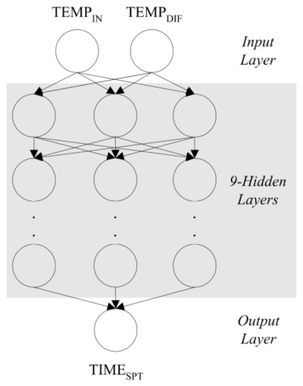 There are two principal reasons to choose the ANN theory to predict TIMESPT in this study. The first is that the ANN model can adopt input variables flexibly. Unlike fuzzy logic (FL) or adaptive neuro fuzzy inference systems (ANFIS), an ANN model can employ a series of inputs for producing outputs. The second reason is that ANN models have proven their stable prediction accuracy and applicability to building thermal controls in the previous studies. These are summarized in Section 2.1. We therefore selected the ANN model over than other machine learning theories.