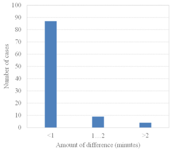 To investigate the accuracy of the prediction results from the optimized ANN model, Pi and Si for the new 100 checking data sets were compared. Figure 10 shows that the results of Pi and Si display a similar pattern. The average difference between them was 0.45 min, which ranged from 0.0 min to 3.9 min. In addition, Figure 11 summarizes the distribution of difference. For 87 of the cases, the difference between Pi and Si was less than 1.0 min. Nine cases were between 1 and 2 min, and four cases were over 2 min.