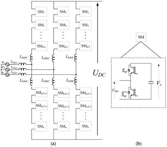 (a) Diagram of the modular multilevel converter (MMC); (b) Diagram of the half H-bridge submodules (SM).