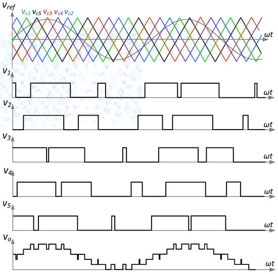 Thus, taking this into account, only N + 1 modulation technique has been chosen to be analyzed in this paper. Considering a 6-level MMC, Figure 2 shows the modulation signals, Vx with x = 1, …, 5, for a single phase. The phase shift between the five carriers, VCx, is θ = 72°. The output waveform is the sum of all the signals.