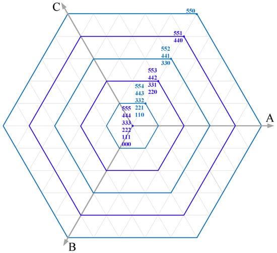SVM can conveniently provide more flexibility to optimize switching waveforms given the existence of redundant switching states and adjustable duty cycles and is suitable to be digitally implemented []. The main drawback of applying SVM to multilevel converters is that the complexity of the algorithm highly grows with the number of levels. Thus, it has not yet been well studied when it is applied to MMCs. In a three-phase n-level converter, there are usually n3 switching states and 6 × (n − 1)2 triangles in the space vector diagram []. Figure 3 shows the space vector diagram for a six-level converter.