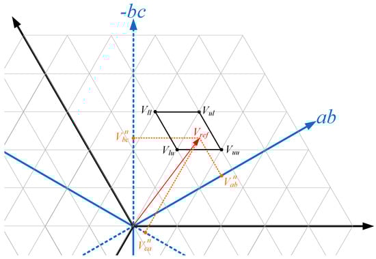 The algorithm used in this article is based on the fast SVM method presented in [], which avoids the use of coordinate transformations and allows its adaptation for any n-level converter with minimum modifications. The algorithm is based on finding the four closest vectors to the reference voltages, as showed in Figure 4, using the normalized line voltages. The vectors are defined by means of the upper and lower rounded integer values from the normalized and voltages according to: