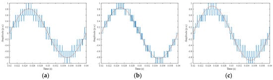 (a) SPWM waveform; (b) SVM waveform; (c) NLM waveform. (Blue line: Normalized reference output. Red line: Normalized output waveform).
