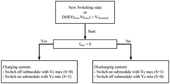 The capacitor voltage algorithm used in this paper is proposed in []. The algorithm reorganizes the PWM gate signals in order to reduce the SM voltage difference along the arm. The proposed capacitor voltage balancing algorithm balances the capacitor voltages when there is a new switching state or when the difference between the maximum voltage of the capacitors and the minimum voltage of the capacitors is greater than the threshold voltage value VThreshold.