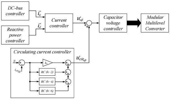 - Moranchel, M.; Bueno, E.J.; Rodriguez, F.J.; Sanz, I. Circulating current elimination in Modular Multilevel Converter with resonant controllers. In Proceedings of the 7th International Symposium on Power Electronics for Distributed Generation Systems (PEDG 2016), Vancouver, BC, Canada, 27–30 June 2016; pp. 1–6.