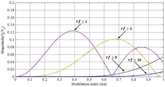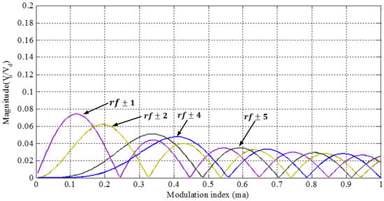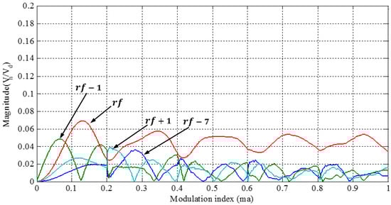 The simulation results obtained for PS-SPWM are shown in Figure 10, which presents the harmonic distribution according to ma. The harmonics with the highest amplitude are generated at rf ± 2 and rf ± 4.