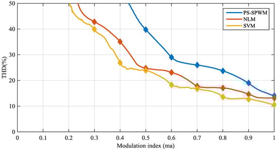 The results for NLM are shown in Figure 12. The harmonics in NLM method have less amplitude compared to PS-SPWM but higher than SVM. The THD obtained with each modulation is shown in Figure 13. The figure represents the THD of the line-to-line voltage according to the modulation index. For the purpose of comparing the THD of the three modulation techniques, different frequencies for each modulation have been employed in order to have the same number of transitions per cycle. Thus, The PS-SPWM uses carrier signals at 750 Hz. The SVM and the NLM calculate the duty cycle by means of a frequency of 5.25 kHz and 3.75 kHz, respectively. The figure shows that, in the case of PS-SPWM, the THD is higher than in NLM and SVM methods. However, as ma increases, the difference between modulation techniques is lower.