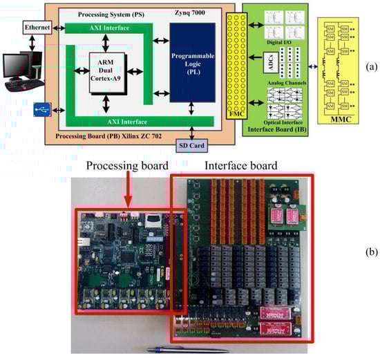 The PB is based on the Xilinx ZC702 Evaluation board (Manufactured by Xilinx, Plano, TX, USA). The ZC702 includes a Zynq-7000 XC7Z020 SoC. This SoC integrates a dual-core ARM Cortex-A9, which constitutes the core of the processing system (PS), and programmable logic (PL) based on an Artix-7 FPGA. The purpose of the PB is twofold: firstly, it implements the bidirectional communication with the host computer through an Ethernet connection and, secondly, it executes all the converter control algorithms [].