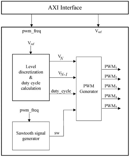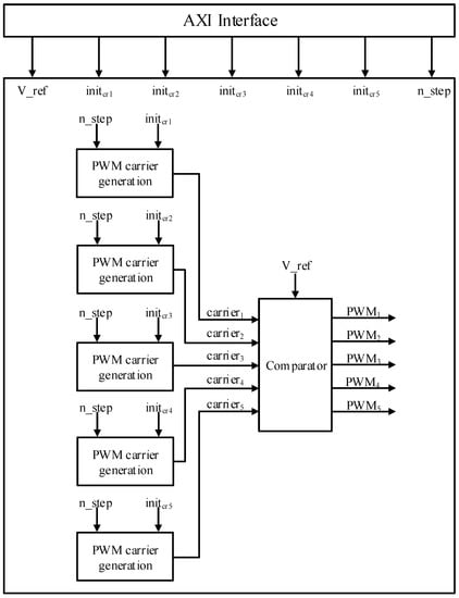 PS-SPWM is a popular multicarrier PWM technique for multilevel converters given its easy digital implementation []. PS-SPWM is based on introducing a phase shift between the carrier signals of contiguous cells that produces a phase-shifted switching pattern between them and generates a stepped multilevel waveform []. The main drawback of this solution is that as the number of levels of the converter increases, the phase shift between carriers become ever smaller, so that the generation of the carriers must be highly accurate.